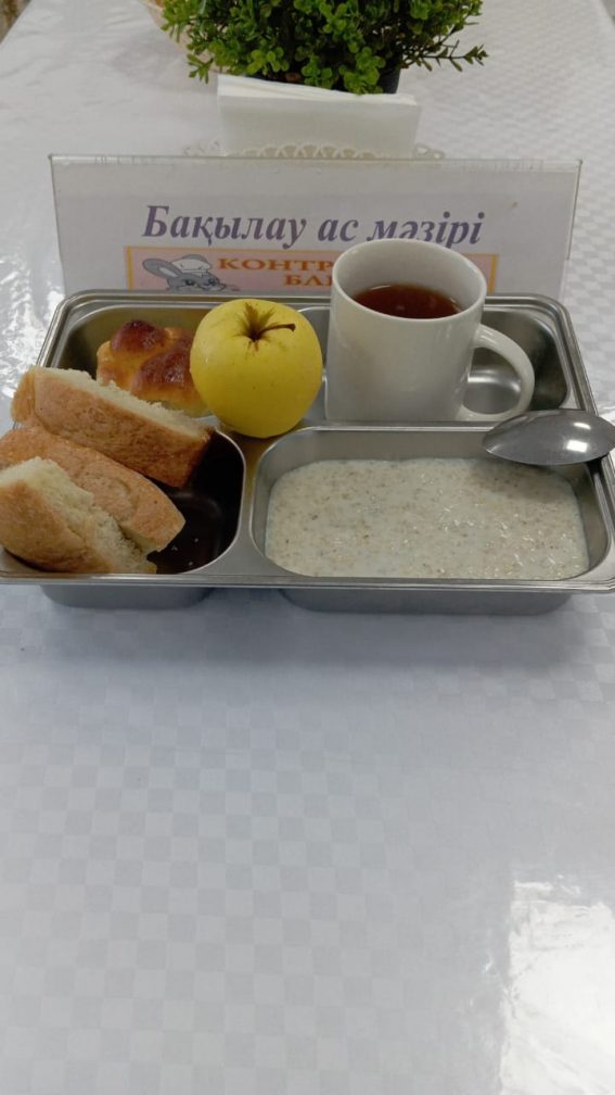 Бақылау ас мәзірі Май қосылған сүтте пісірілген арпа ботқасы Тәтті нан Кептірілген жемістен компот Қара бидай наны Алма