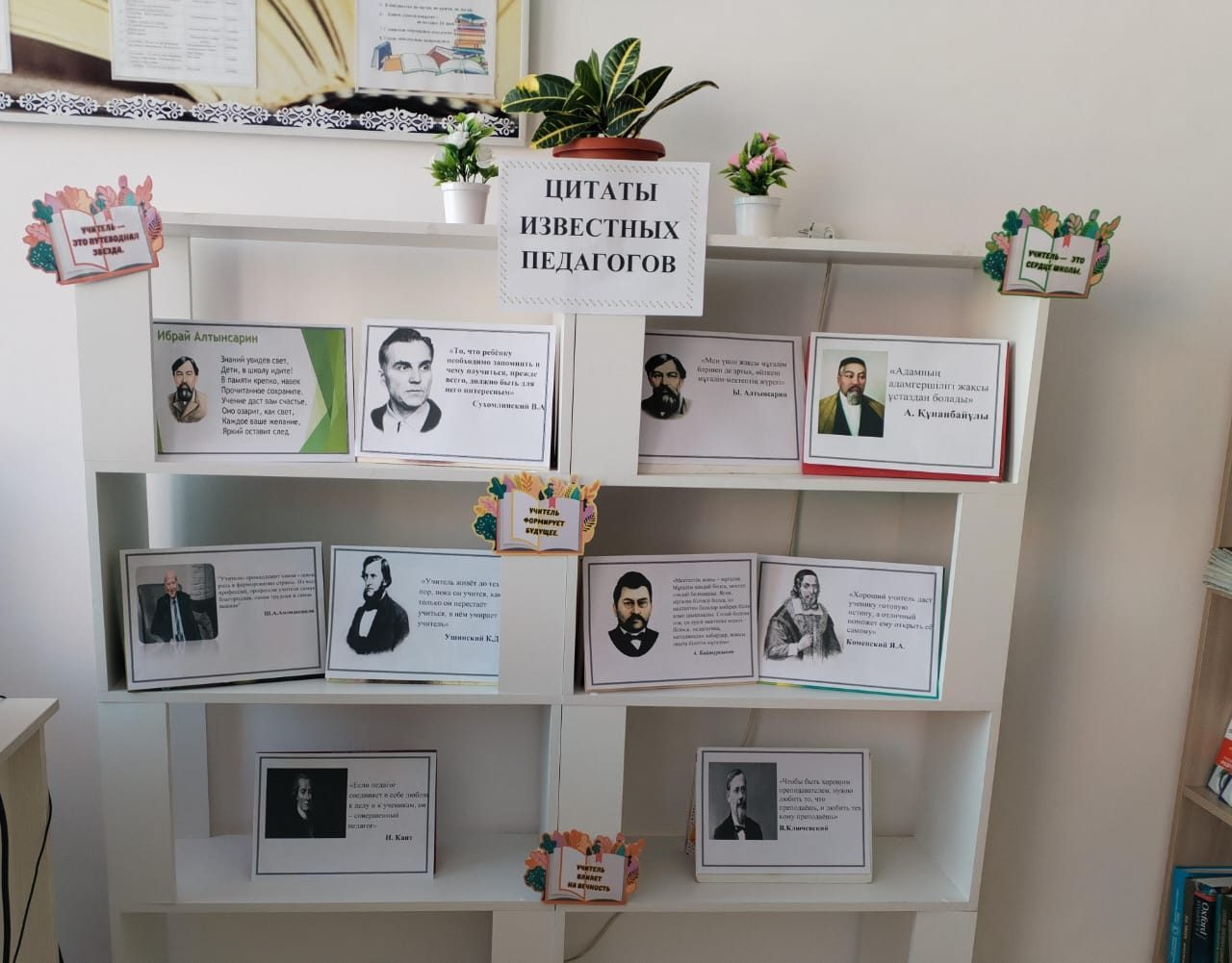 Мұғалімдер күніне орай біздің мектепте "Атақты педагогтардың дәйексөздері" атты ерекше көрме ұйымдастырылды. Көрмеде көрнекті мұғалімдердің, ойшылар мен жазушылардың мұғалімнің адам өміріндегі рөлі, сондай-ақ білім туралы мәлімдемелері орналастырылған.